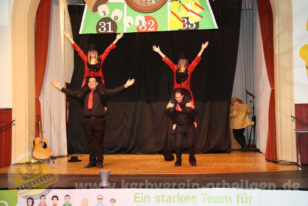 Spiel­te eben noch der Musik­ver­ein ein paar zünf­ti­ge Lie­der, wur­de es plötz­lich ganz dun­kel und still im Saal. Ein Ken­ner der Oar­hell­jer Kerb weiß ganz genau was das bedeu­tet: Die Kerb­mann­schaft steht in den Start­lö­chern für den dies­jäh­ri­gen Kerb-tanz 2013. Für die­ses Jahr wur­de der Tanz durch die bei­den neu­en Trai­ne­rin­nen Bian­ca Balz­ke und Thea Hüt­ten­ber­ger in oft­mals auch schwie­ri­gen Ein­zel­stun­den bis zur annä­hern­den Per­fek­ti­on trai­niert und ein­stu­diert. An die­ser Stel­le noch­mals vie­len Dank an Kim Kohl­ba­cher für die jah­re­lan­ge Vorarbeit.