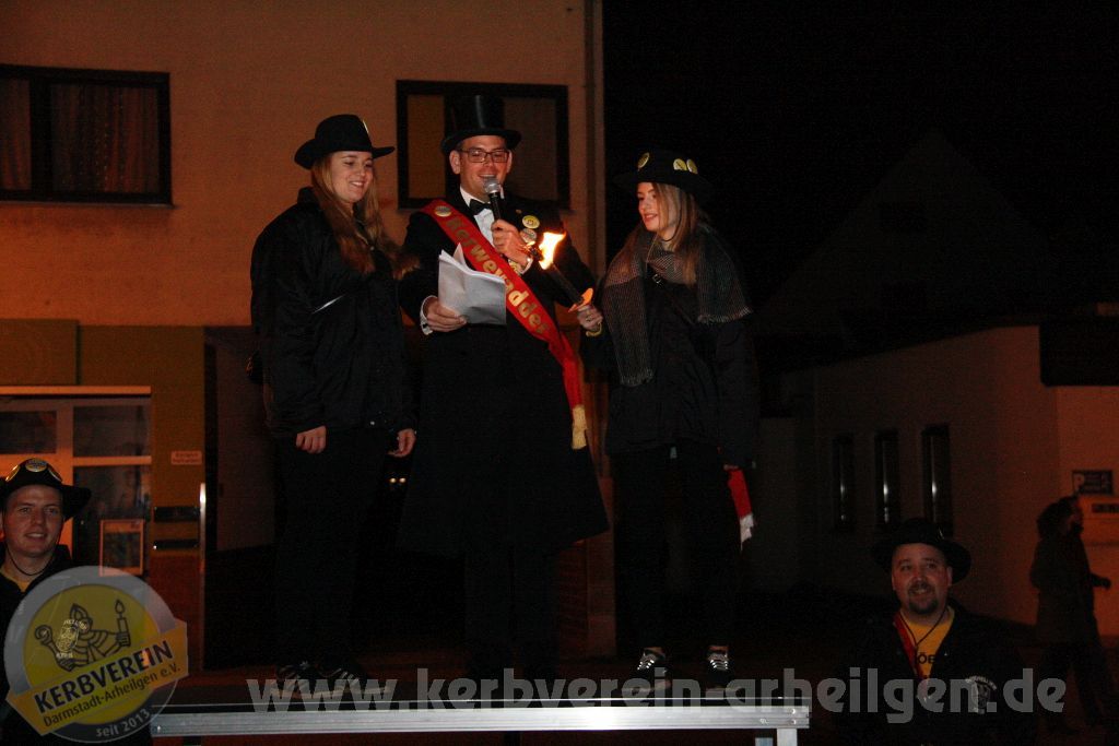 Am Freitagabend fand zunächst der Kerbgottesdienst in der Auferstehungsgemeine statt. Was die Kerbmannschaft jedoch noch nicht wusste, Pfarrer Marks hat sich für die Predigt etwas ganz Besonderes ausgedacht: Er baute Inhalte der diesjährigen Kerbzeitung geschickt ein und ließ sie von den Kerbborsche und ‑mädscher vorlesen, so dass diese Teil davon wurden. Nach der Kirche folgte ein kleiner Umtrunk vorm Gemeindehaus und der anschließende “Kerbumzug” mit dem Kerbkranz in Richtung Löwen, wo der Kerbkranz zum Kranzspruch durch Kerwevadder Achim empor gezogen wurde und von fort an für alle erkennbar zeigt: Die Oarhelljer Kerb ist do!