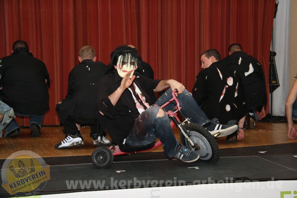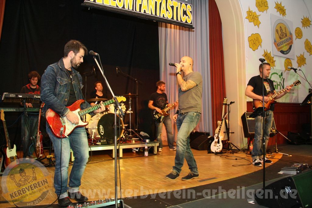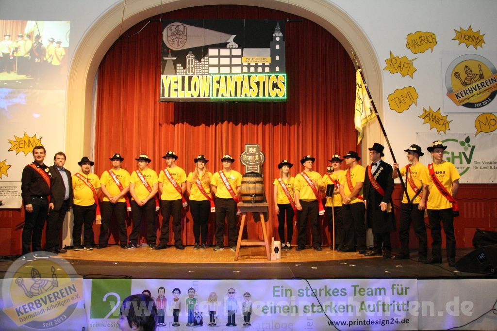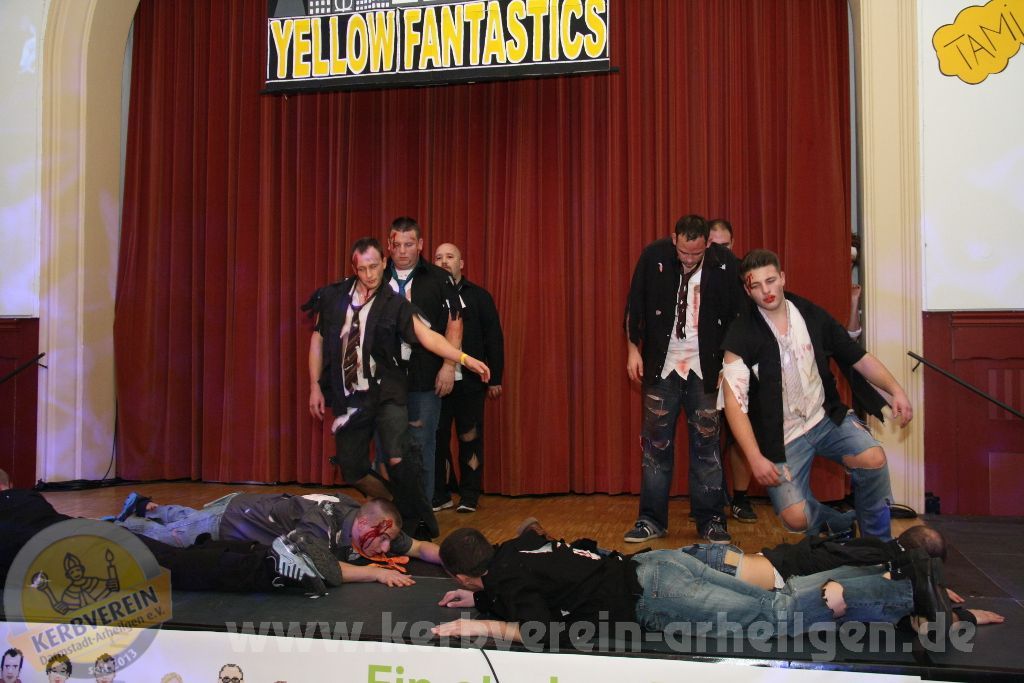 Samstagabend heißt es wieder: “Bühne frei!”, für das Showprogramm der Oarhelljer Kerbmannschaft. Das Motto lautete in diesem Jahr “Yellow Fantastics – Gemeinsam unbesiegbar!”, welches getreu dem Namen aufzeigt, dass man gemeinsam alles schaffen kann. Dass in Arheilgen gerne gefeiert wird ist kein Geheimnis. Ebenso offensichtlich ist es, dass leider nicht alle Einwohner hier dies auch tun. Jedem seine Meinung und persönliche Haltung – doch aufgrund der eigenen miesen Laune den anderen das Feiern verbieten? Das hat das Böse, welches übrigens im Bunde mit dem geheimen Rat aus Wixhausen war, am ersten Novemberwochenende versucht. Den Feiernden wurden die Luftballons zerstochen, das Bier geklaut und der Nagel einfach ins Holz geschlagen. Allerdings hat das Böse die Rechnung ohne den wuchtigen Nailman, die schöne clAIR und den abgebrühten Bierkuless gemacht. Es dauerte nur wenige Minuten und das angerichtete Chaos war aufgeräumt, so dass die Feier weiter gehen konnte. Dass dies für Ärger beim Bösen sorgte ist sicherlich nachvollziehbar. Durch eine List, einem vergifteten Kerb-Schöppche, gelang es, die drei Superhelden außer Dienst zu stellen. Allerdings ist nichts so abgehärtet wie die Leber oder der Magen eines Kerbborschen oder ‑mädschen. Nach einer kurzen Pause waren sie wieder auf den Beinen und es gelang ihnen mit Unterstützung des Rates, der gelben Leuchtstäbe – aufgeladen durch gute Laune – und der anderen Einwohner sich zu den Yellow Fantastics zu verbinden und dem Bösen letztendlich klar zu machen, wer in Oarhellje das Sagen hat.