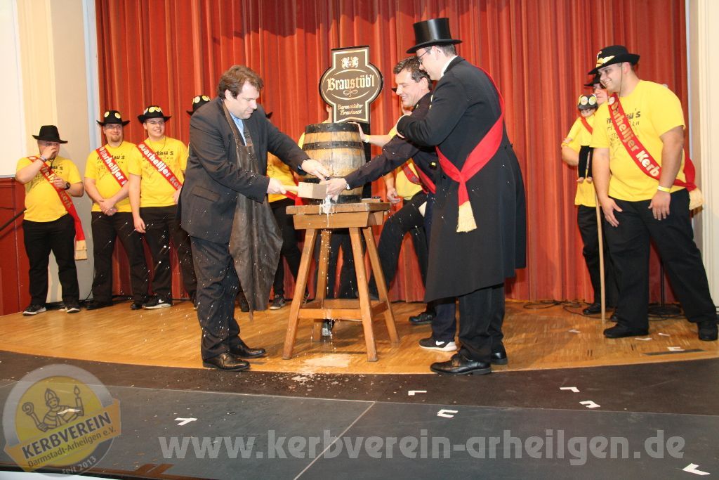 Von nun an ging es sprichwörtlich Schlag auf Schlag! Kaum hing der Kranz in der Luft, wurde es im Löwensaal auch schon unruhig. Grund hierfür war der Einmarsch der Kerbmannschaft in Begleitung des ersten Vorsitzenden sowie des diesjährigen Schirmherren Hanno Benz (SPD), welcher sich auch im Anschluss Schlag auf Schlag dem Bieranstich widmete. Ein Unterfangen, welches den Schirmherren und ‑damen der vergangenen Jahre sicherlich besser gelungen ist. Nachdem jedoch auch die letzten Pfützen von der Bühne beseitigt wurden, konnte der stellvertretende Vorsitzende und langjährige Kerbborsch Rafael Spano ein ganz besonderes Anliegen in Angriff nehmen: Es wurde ihm die Ehre zugetragen, den Kerwevadder Achim Horneff mit dem Bestreiten der Kerb im 10. Jahre in den Kreis der “Golden Boys” aufzunehmen. Spätestens jetzt weiß auch der letzte Zweifler: Achim l(i)ebt die Kerb!